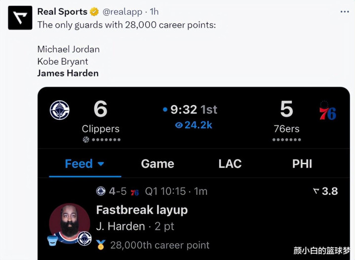 美媒写道,NBA历史上拿到28000分以上的得分后卫只有乔丹、科比、哈登三人。