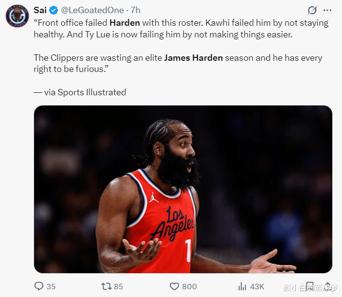《体育画报》赛前:快船管理层打造的这套阵容辜负了哈登申银策略,伦纳德无法保持健康让哈登失望,泰伦卢也让他失望,因为泰伦卢没有让比赛变得轻松。快船正在浪费一个精英级哈登的赛季,哈登完全有理由感到愤怒。